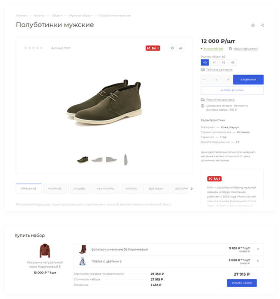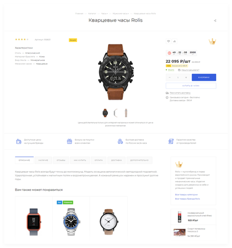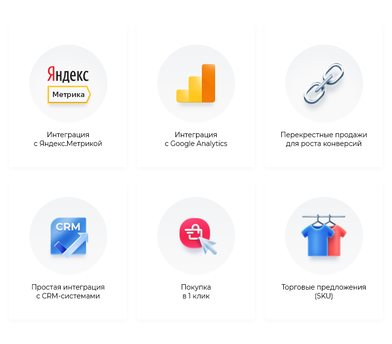 Интеграция с Яндекс.Метрикой, Google Analytics и социальными сетями, перекрестные продажи для повышения конверсий, интеграция с CRM-системами, покупка в 1 клик, торговые предложения.