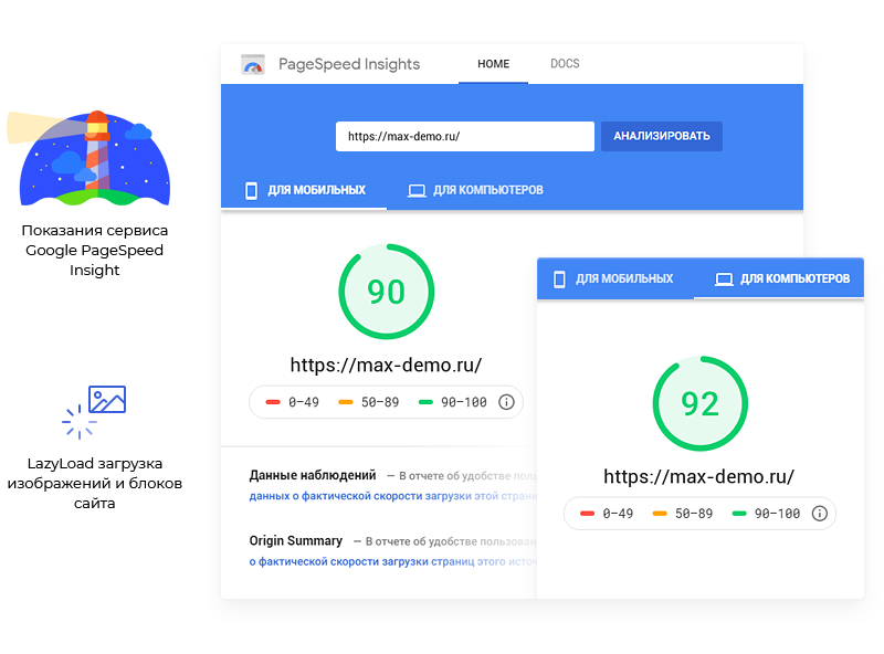 Новая технология увеличивает скорость загрузки демо-версии Аспро: Максимум до 90 баллов для мобильных и до 92 баллов для компьютеров. Данные были получены 19 ноября 2019 года на хостинге Reddock с помощью Google PageSpeed Insight. Используйте эту возможность и опережайте конкурентов!