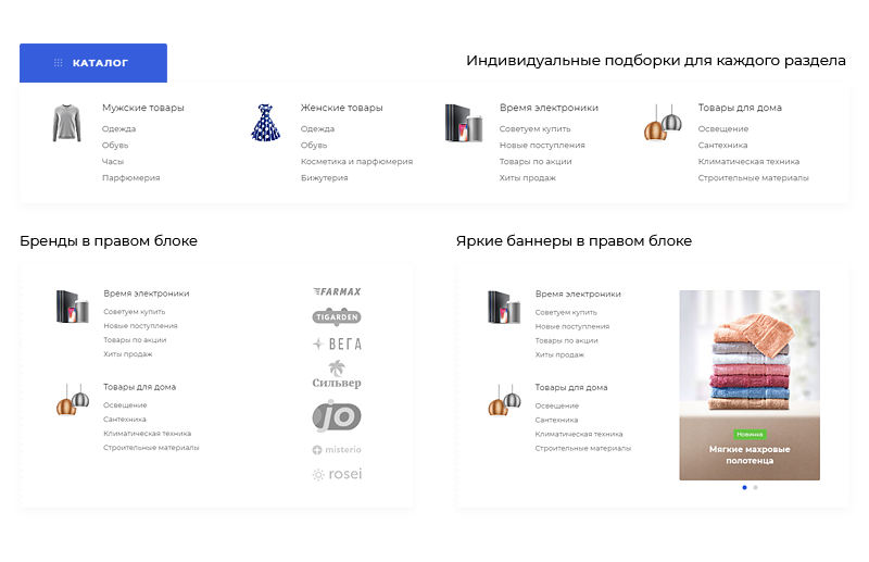 Мега-меню — удобный способ презентации товаров и контента на сайте. Гибкие настройки позволяют создавать меню под интересы каждой целевой аудитории. Это гарантирует быструю навигацию для покупателей и выгодную подачу ассортимента для владельца.